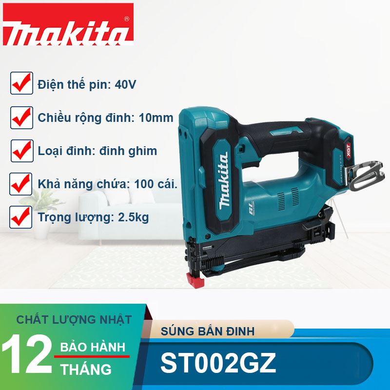 Công nghệ XPT bảo vệ máy khỏi bụi và ẩm, cho phép thiết bị vận hành bền bỉ ngay cả tại các công trường xây dựng khắc nghiệt. Nếu bạn đang tìm hiểu máy bắn đinh ghim Makita nào tốt để xử lý các loại vật liệu bọc khổ lớn, ST002GZ chính là sự đầu tư xứng đáng giúp nâng cao tính thẩm mỹ và độ bền cho công trình.