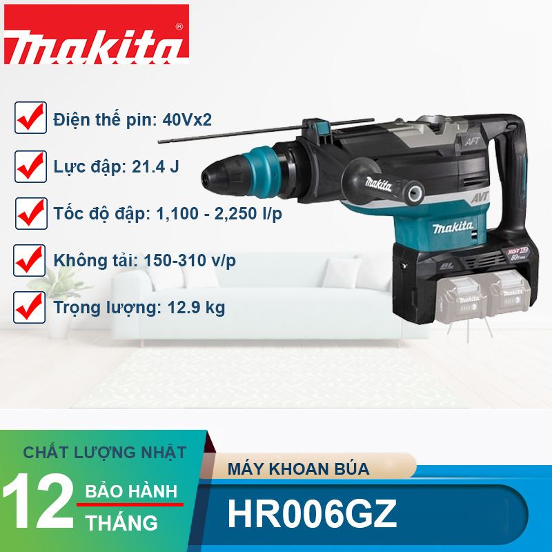 Lực đập 21.4J uy lực, hệ pin kép 40Vx2 mạnh mẽ và tích hợp đầy đủ các công nghệ an toàn hiện đại đã biến Máy khoan búa dùng pin 40Vx2 Makita HR006GZ thành thiết bị không có đối thủ trong phân khúc. Hãy đến với D.I.Y.Home.Depot để trang bị ngay giải pháp khoan phá bê tông đỉnh cao nhất thế giới.