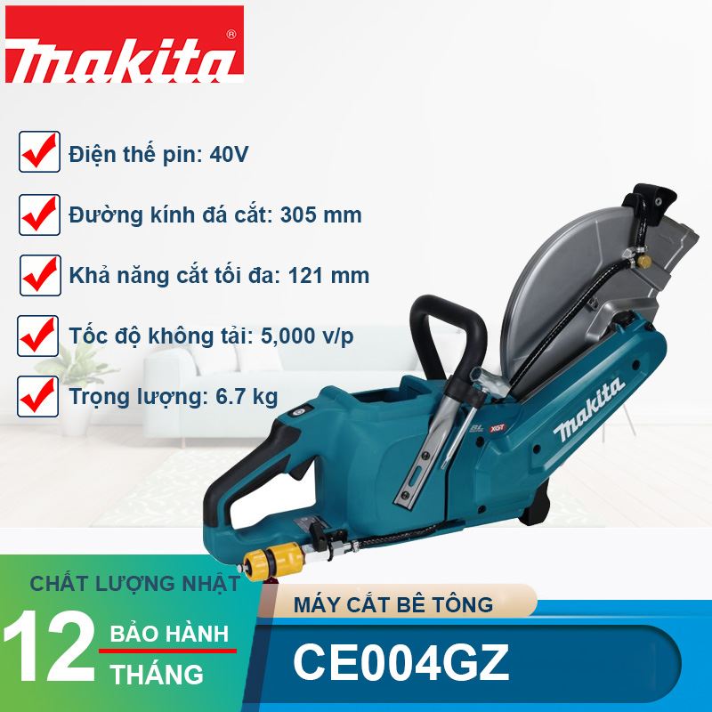 Việc cắt bê tông tại những vị trí chật hẹp hoặc trên cao luôn đòi hỏi một thiết bị vừa đủ mạnh nhưng phải đủ nhẹ để thao tác dễ dàng. Máy cắt bê tông dùng pin 40V Max Makita CE004GZ ra đời để giải quyết bài toán đó. Sử dụng đường kính đá cắt 305 mm, máy mang lại khả năng cắt sâu tối đa lên tới 121 mm, giúp bạn hoàn thành các đường cắt chuẩn xác mà không cần tốn quá nhiều sức lực.