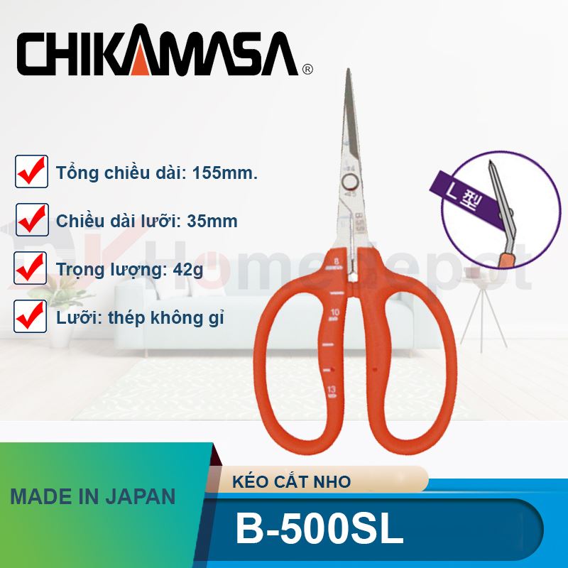 Tại D.I.Y.Home.Depot, chúng tôi phân phối chính hãng dòng Kéo cắt nho Chikamasa B-500SL nhập khẩu từ Nhật Bản. Chúng tôi cam kết mang đến những dụng cụ làm vườn tốt nhất, giúp nhà nông và nghệ nhân cây cảnh nâng cao năng suất và chất lượng công việc.