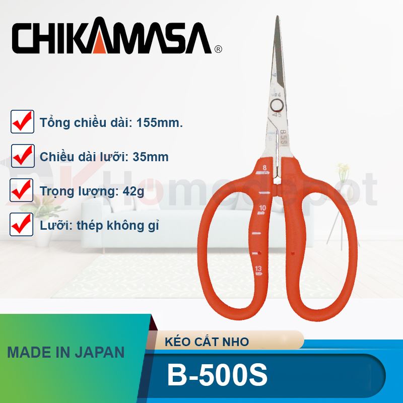Tại D.I.Y.Home.Depot, chúng tôi phân phối chính hãng dòng Kéo cắt nho Chikamasa B-500SL nhập khẩu từ Nhật Bản. Chúng tôi cam kết mang đến những dụng cụ làm vườn tốt nhất, giúp nhà nông và nghệ nhân cây cảnh nâng cao năng suất và chất lượng công việc.