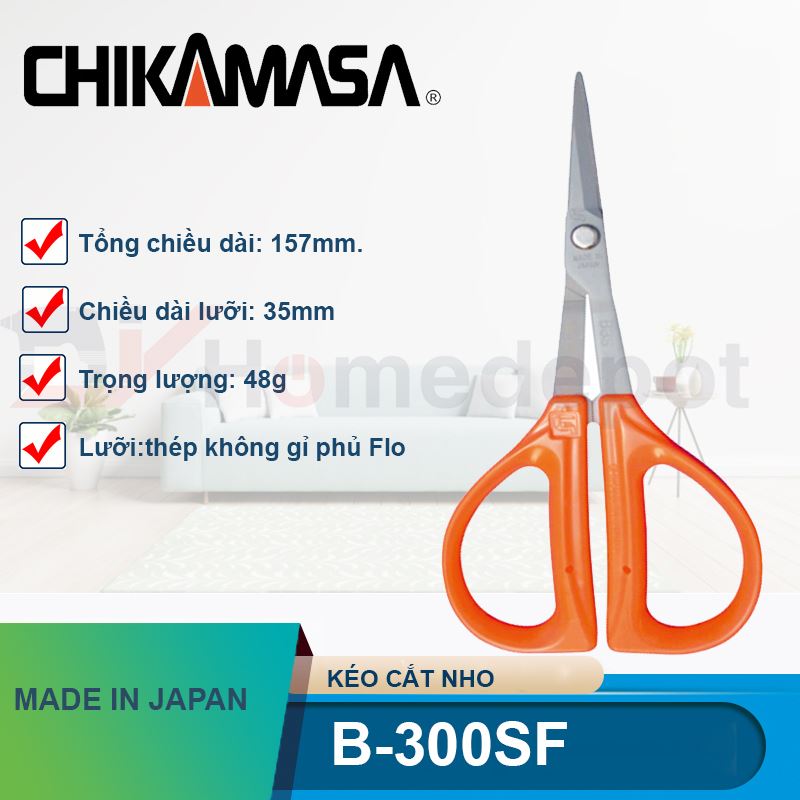 Tại D.I.Y.Home.Depot, chúng tôi phân phối chính hãng dòng Kéo cắt nho Chikamasa B-300SF nhập khẩu trực tiếp từ Nhật Bản. Chúng tôi cam kết cung cấp những dụng cụ tốt nhất để hỗ trợ người làm vườn tối ưu hóa quy trình thu hoạch và nâng cao giá trị thương mại cho nông sản.