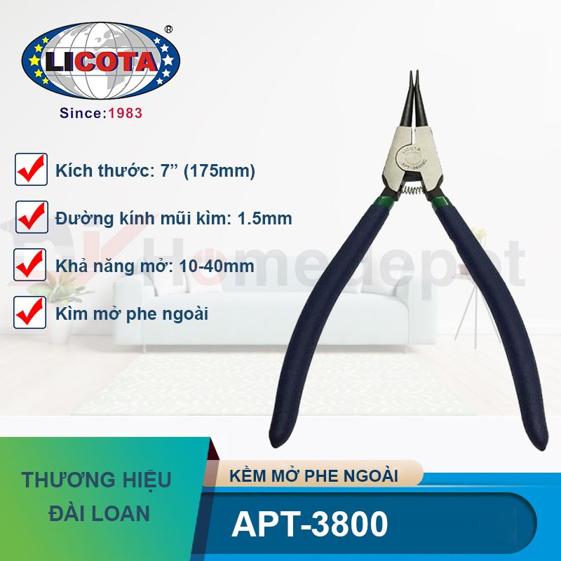 Sự kết hợp hoàn hảo giữa thép CR-V siêu cứng, khả năng mở linh hoạt 10-40mm và hai tùy chọn mũi thẳng/cong đã tạo nên sức hút cho Kìm mở phe ngoài 7" Licota APT-3800. Dòng sản phẩm này chính là minh chứng cho tinh hoa dụng cụ từ Đài Loan, giúp mọi thao tác lắp đặt vòng phe trở nên đơn giản và chính xác hơn bao giờ hết.