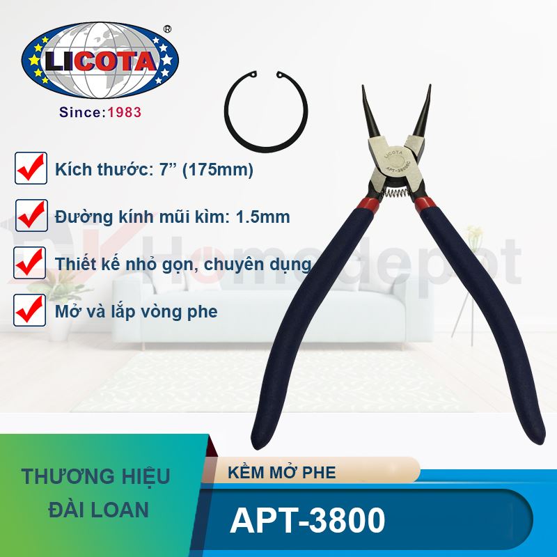 Trong quy trình bảo trì máy móc, việc tháo lắp vòng phe trong (vòng chặn nằm bên trong lỗ) luôn đòi hỏi sự chuẩn xác để tránh làm hỏng rãnh phe hoặc làm biến dạng vòng chặn. Kìm mở phe trong 7" Licota APT-3800 là dòng sản phẩm cao cấp được thiết kế riêng biệt cho nhiệm vụ này. Với sự đa dạng về thiết kế mũi kìm, dòng APT-3800 giúp người thợ linh hoạt xử lý mọi tình huống kỹ thuật từ không gian thoáng đến các góc khuất chật hẹp.