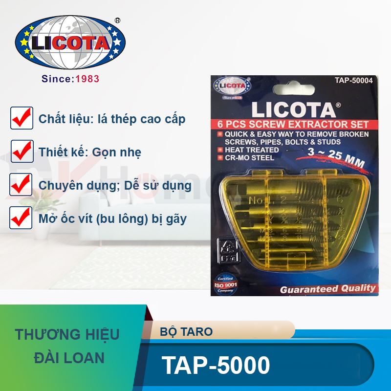 Thiết kế chuyên dụng, chất liệu thép CR-V siêu cứng và dải kích thước linh hoạt từ 3mm đến 25mm đã tạo nên đẳng cấp cho Bộ taro lấy ốc gãy Licota TAP-5000. Đây là thiết bị không thể thiếu để nâng tầm tính chuyên nghiệp và hiệu quả cho xưởng sửa chữa của bạn.