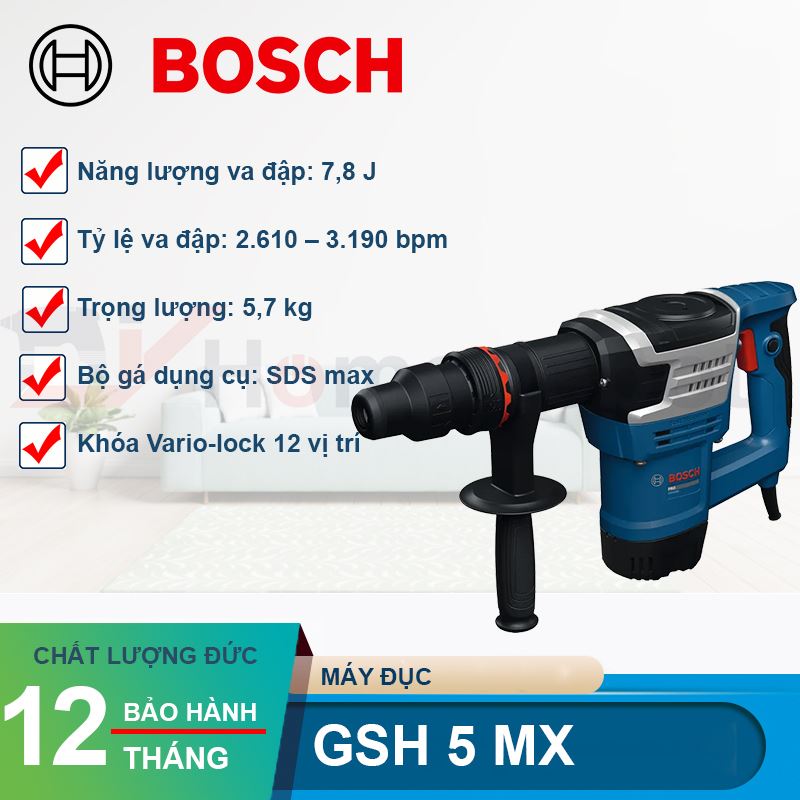 Trong phân khúc máy đục bê tông tầm trung, Bosch GSH 5 MX nổi lên như một tiêu chuẩn mới về hiệu suất và sự tiện dụng. Sử dụng hệ thống đầu kẹp SDS Max chuyên nghiệp cùng năng lượng va đập cải tiến lên tới 7.8J, chiếc máy này không chỉ giúp phá dỡ nhanh hơn mà còn mang lại khả năng tùy chỉnh mũi đục linh hoạt, đáp ứng mọi góc độ thi công khó khăn nhất.