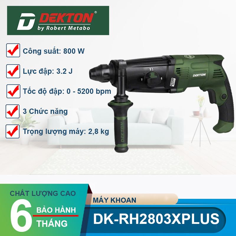 • Mở rộng phạm vi làm việc: Trong khi các dòng máy phổ thông thường dừng lại ở mức 26mm, Dekton DK-RH2803XPLUS cho phép bạn khoan các lỗ kỹ thuật lên đến 28mm. Đây là ưu thế cực lớn khi thi công các hệ thống điện nước (M&E) hoặc lắp đặt bu-lông chờ cỡ lớn.