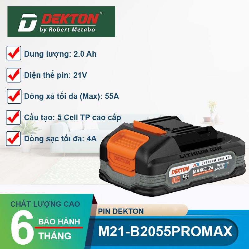 Pin Dekton 21V 2.0Ah M21-B2055PROMAX không chỉ là một viên pin, nó là lời cam kết về hiệu suất và an toàn. Nếu bạn cần một viên pin 5 cell nhỏ gọn, dòng xả cực đại 55A và độ bền vật liệu Nhật Bản, thì B2055PROMAX chính là sự đầu tư không thể tuyệt vời hơn.