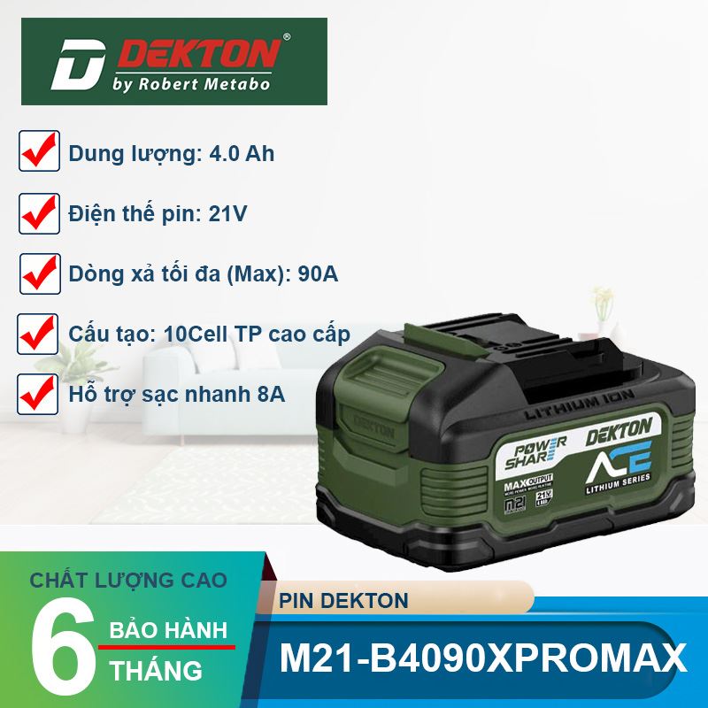 Pin Dekton 21V 4.0Ah M21-B4090XPROMAX là minh chứng cho sự kết hợp giữa công nghệ năng lượng và vật liệu bảo vệ đỉnh cao. Nếu bạn cần một viên pin 10 cell có dòng xả 90A siêu mạnh và độ bền vật liệu Nhật Bản trong bộ vỏ màu Oliu đẳng cấp, thì XPROMAX chính là sự đầu tư xứng đáng nhất.