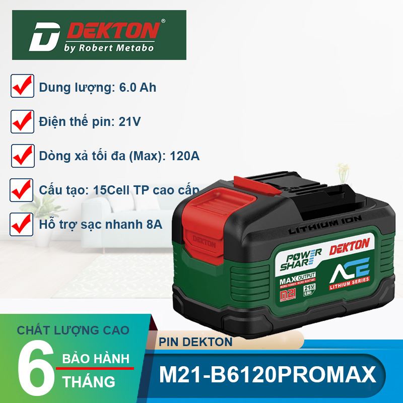 Pin Dekton 21V 6.0Ah M21-B6120PROMAX chính là minh chứng cho sức mạnh và sự bền bỉ. Nếu bạn đang tìm kiếm một viên pin 15 cell có dòng xả 120A siêu mạnh cùng độ bền vật liệu Nhật Bản, thì đây chắc chắn là sự đầu tư xứng đáng nhất.