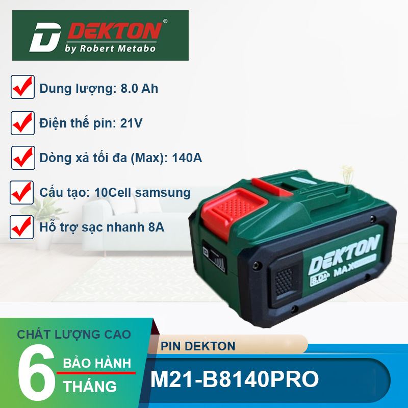 Pin Dekton 21V 8.0Ah M21-B8140PRO chính là minh chứng cho sự đột phá về sức mạnh. Nếu bạn cần một viên pin 10 cell có dòng xả 140A cực khủng và chất lượng cell Samsung đỉnh cao, thì đây chính là sự đầu tư không thể tuyệt vời hơn.